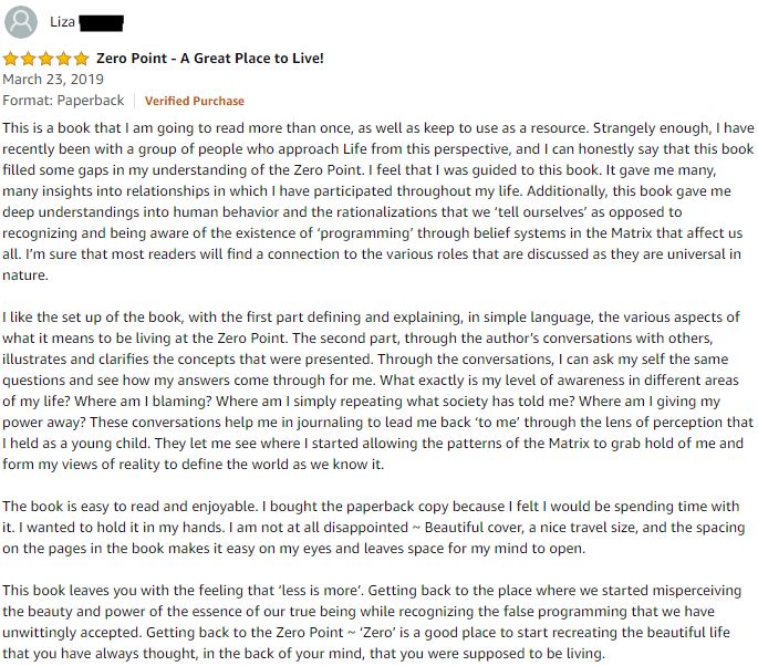 Liza wrote on Amazon: “Zero Point – A Great Place to Live!”